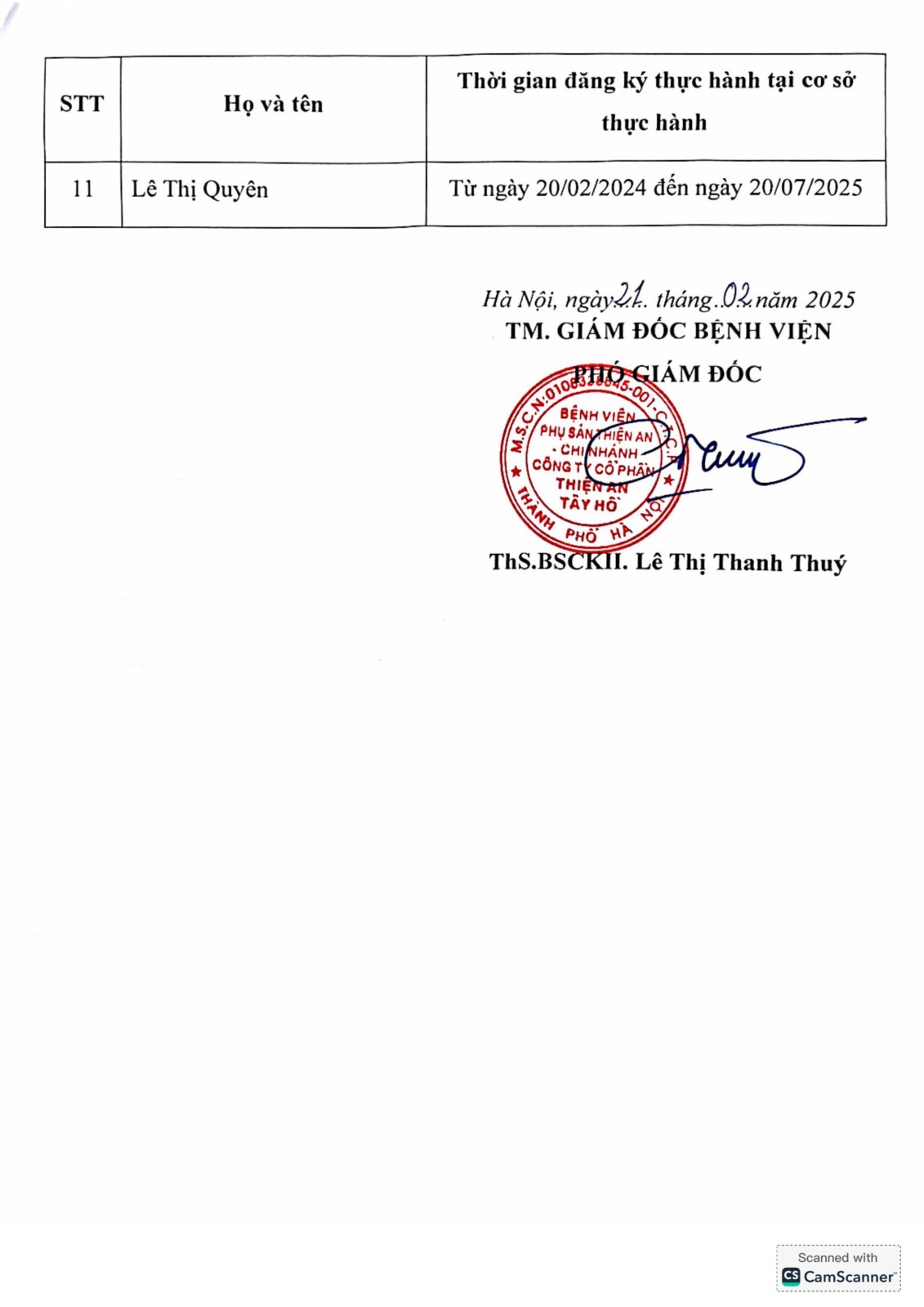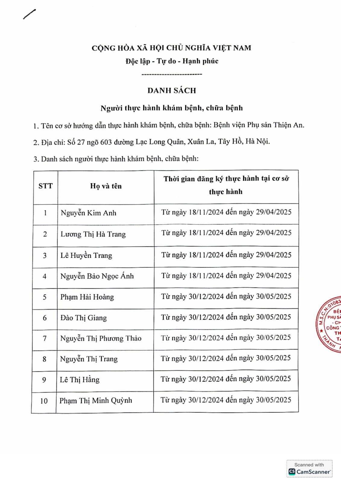 Danh sách người thực hành khám bệnh, chữa bệnh tại Bệnh viện Phụ sản Thiện An (cập nhật đến tháng 2 năm 2025)