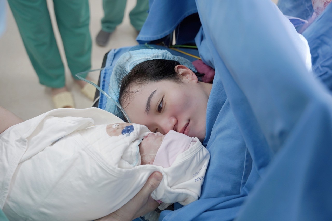 Chị H. T (34 tuổi) và em bé sau ca phẫu thuật được GS Nguyễn Viết Tiến trực tiếp thực hiện